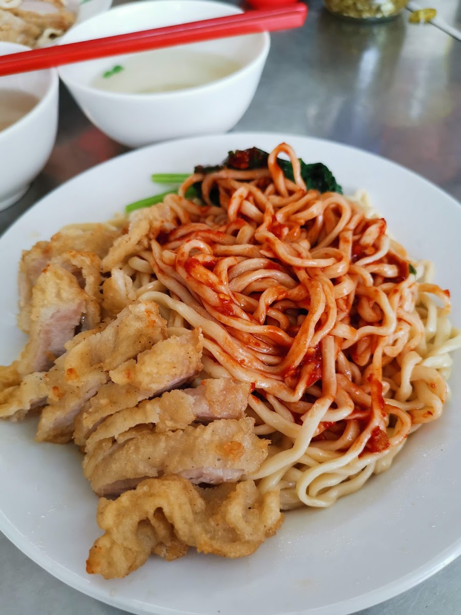 Special noodles with their own unique taste. The portion is huge so if you order the large one be sure you have a huge appetite because if a small feels large, large will be enormous! The char siew and fried pork as well as the wantan are delicious too. You can order them as sides dishes or pick those as toppings for your noodle.